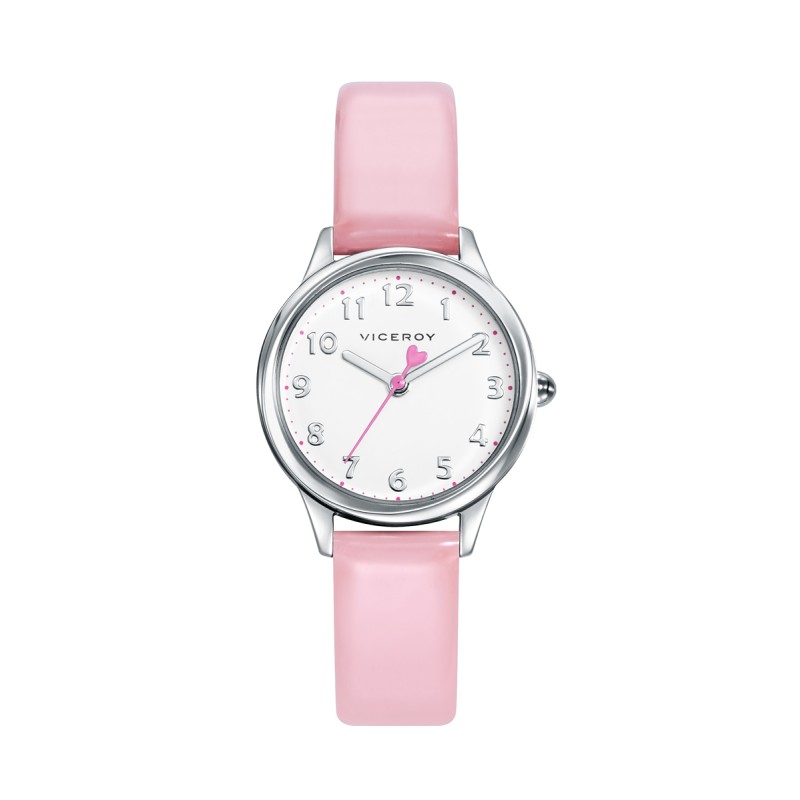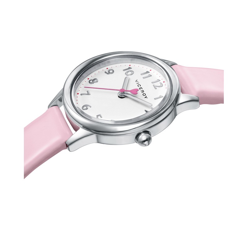 Pack de Niña Viceroy Sweet con un reloj tres agujas con la caja de acero y correa de piel sintética rosa, esfera en blanco con el segundero en rosa y altavoz inalámbrico blanco.