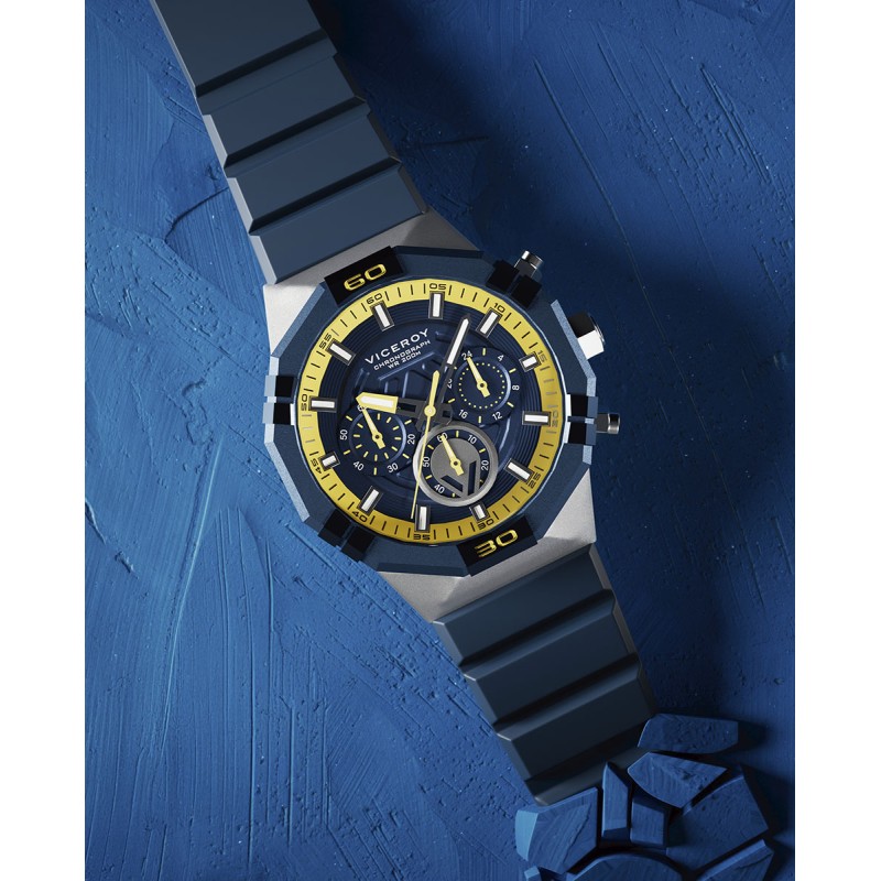 Este reloj con cronógrafo para hombre es el complemento perfecto para quienes buscan estilo y rendimiento. Con su caja bitono de acero e Ip azul, aporta un diseño moderno y elegante. La correa de silicona azul asegura un ajuste cómodo y resistente. La esfera azul, con índices en plata, es el centro de atención, mientras que las agujas horarias en color plata, con la punta de la aguja de horas en amarillo, añaden un toque de distinción. Las agujas de segundos y las contadoras en amarillo complementan el conjunto con un contraste vibrante. Con cristal mineral y resistencia hasta 20 Atm, este reloj está diseñado para resistir y destacar en cualquier ocasión.