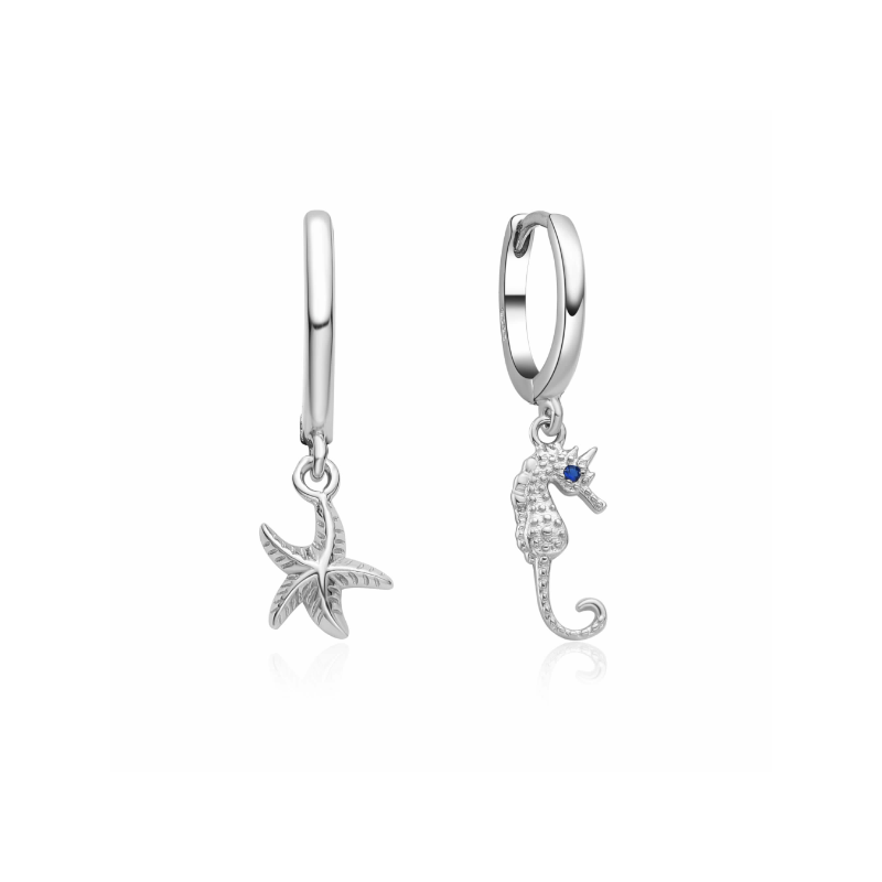 Estos divertidos aros con una estrella y caballito de mar, rellenos de piedras azules, están fabricados en plata de ley y tienen un diámetro de 1.3cm.