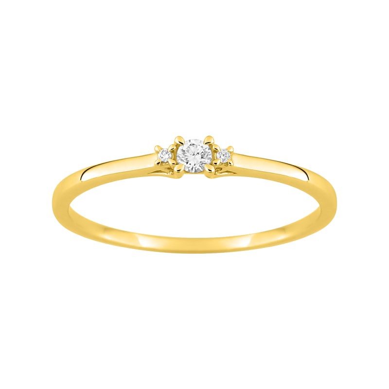 Preciosa sortija fabricada en oro amarillo 9 kilates y tres brillantes en paralelo.