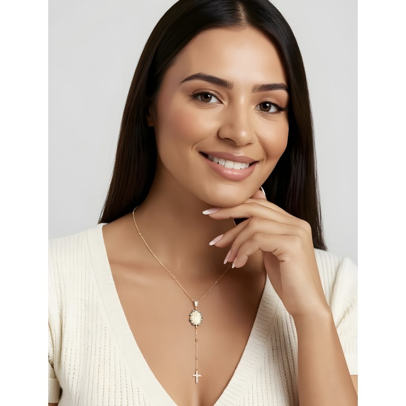 Precioso collar de bolitas con una medalla de la virgen, turquesas y cruz. Su forma es como la de un rosario pero más corto, 45cm. y con un alargador para ajustar el largo total. Está fabricado en plata de ley con un baño de oro de 18 kilates.