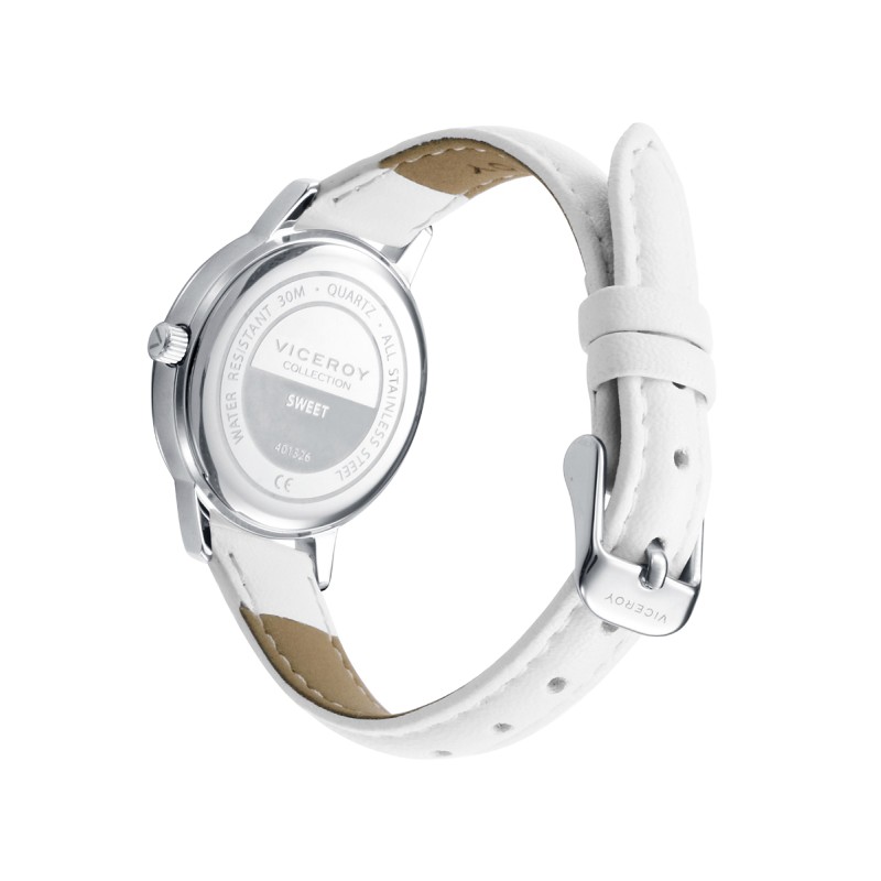 Pack de Niña Viceroy Sweet con un reloj tres agujas con la caja de acero y correa de piel sintética rosa, esfera en blanco con el segundero en rosa y altavoz inalámbrico blanco.